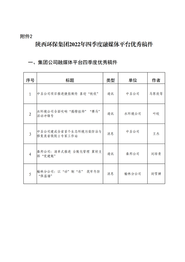 為加強集團公司門戶網站、微信公眾號、新浪微博、視頻號等融媒體平臺的稿件采編工作,鼓勵廣大通訊員圍繞企業中心工作撰寫出高質量的稿件,發揮優秀稿件的示范作用,為集團高質量發展鼓與呼,按照集團公司《關于建立政務信息采用情況通報和優秀稿件評選制度的通知》(陜環司函(2021〕31號)文件要求,現將2022年度集團公司融媒體平臺稿件采用及2022年四季度優秀稿件評選情況通報如下: