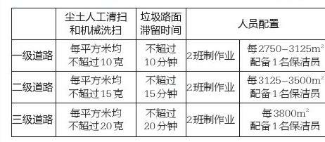 標準提到,西安市道路清掃保潔等級劃分為一級、二級、三級道路。道路清掃保潔質量應達到“道牙無塵,路無雜物,設施整潔,路見本色”的質量標準。鐘鼓樓廣場、東南西北大街、省委周邊道路、大雁塔廣場和周邊道路、新城廣場周邊道路、張家堡廣場和周邊道路等重點區域地面塵土,人工清掃每平方米不超過5克,垃圾路面滯留時間不超過5分鐘;保潔員人員配備上,上述重點地區按三班制作業,每2750平方米配備一名保潔員(一、二、三級道路作業標準見表格)。